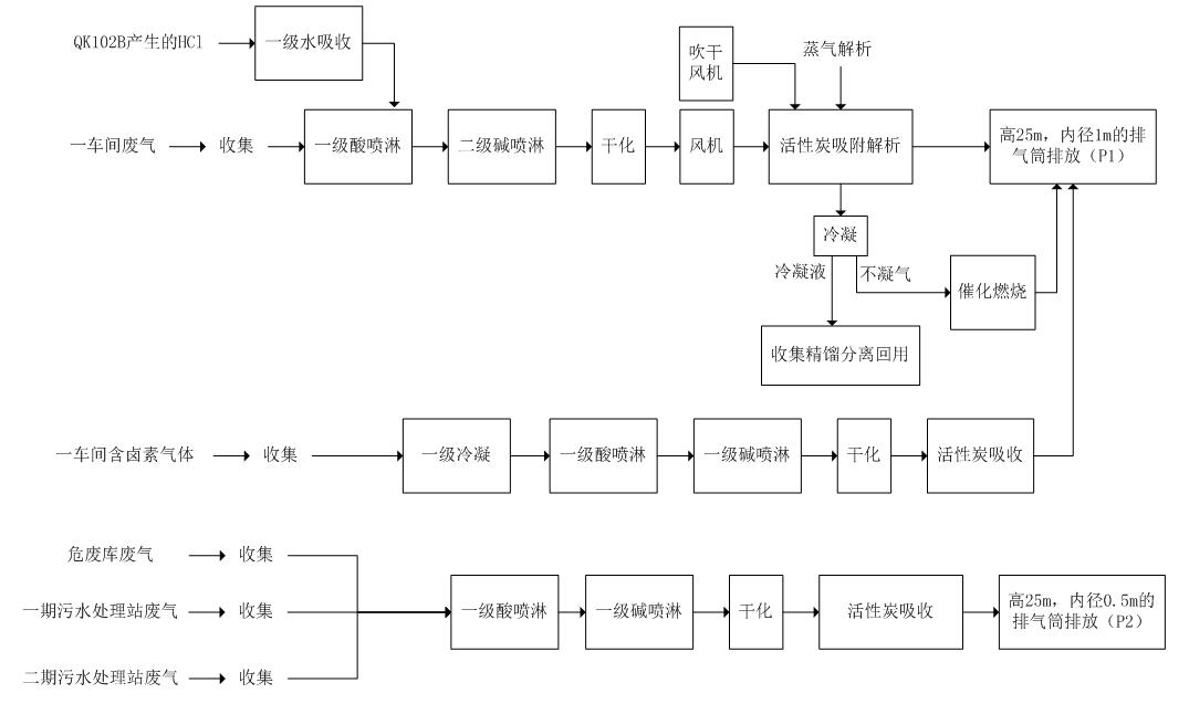 廢氣進(jìn)入冷凝器,去除部分有機(jī)溶劑,再進(jìn)入酸洗塔、堿洗塔,去除廢氣中的酸堿成分,后進(jìn)入干化器,去除廢氣水分,后進(jìn)入活性炭吸附裝置,吸附VOCs,潔凈氣體通過排氣筒達(dá)標(biāo)排放?;钚蕴课窖b置為非再生式,活性炭吸附飽和之后,作為危廢處理?;钚蕴课焦拊O(shè)計(jì)按二級吸附設(shè)計(jì),預(yù)留裝填活性炭位置。